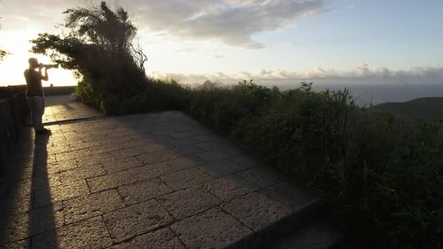 A panning shot of a photographer silhouetted on a stone platform in Rio de Janeiro, Brazil. As the camera pans left, the sun is directly behind his head in the left half of the frame, while the right side shows some trees and plants with the ocean in the distance.