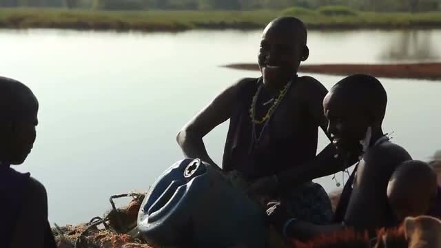 322382 - Maasai lady loading barrels of water onto donkey at the river edge