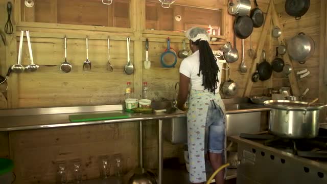> SF_Woman cleans plantains at sink_rear wide sliding-.mov