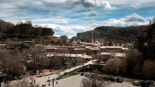 The village of Rupit in a sunny day with a lot of clouds in the blue sky.