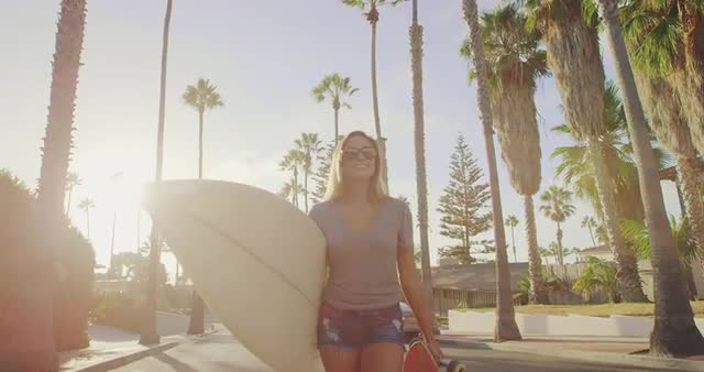 4k lifestyle clip of happy attractive surfer girl skateboarding