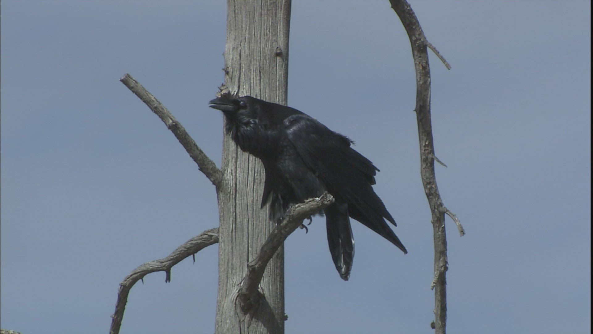 A raven perched in a dead tree. He looks around and squawks.