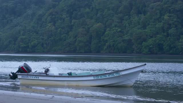 > Parque Nacional boat floating in shallow water off shore, tele