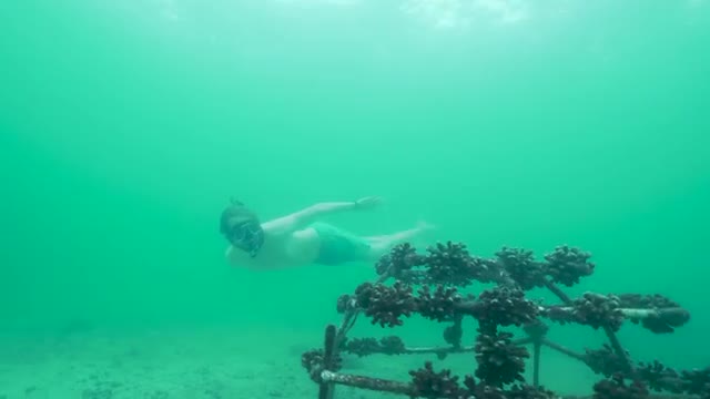 > Man swimming underwater by coral garden