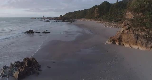 An eye-catching 4k aerial flight over Woodpecker Bay, Tiromoana, West Coast New Zealand. Woodpecker Bay is located on the West Coast between Punakaiki and Charleston and the surf break is at the southern end of Woodpecker Bay by Seal Island.