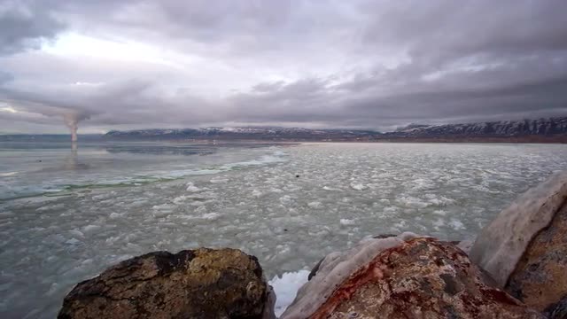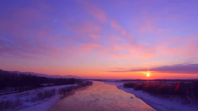 Aerial shot of a river with steam coming off of it. Shot in winter in Montana.