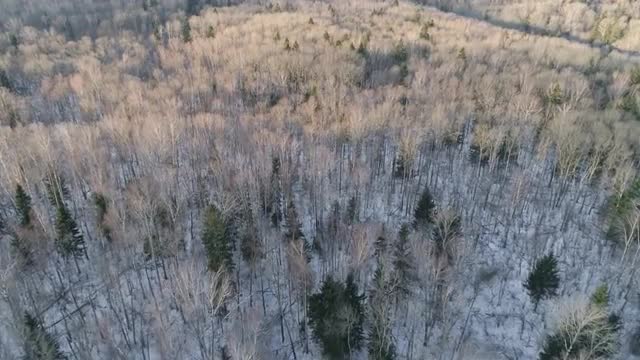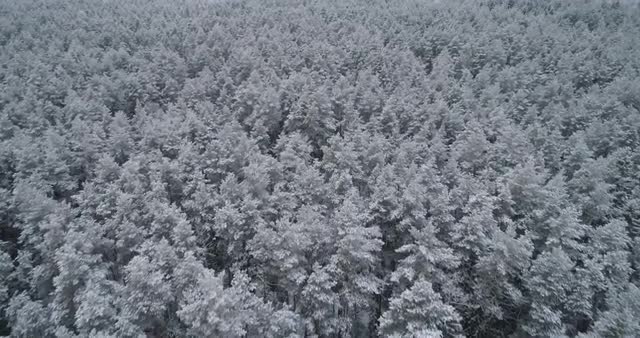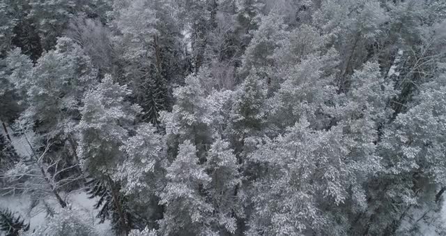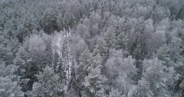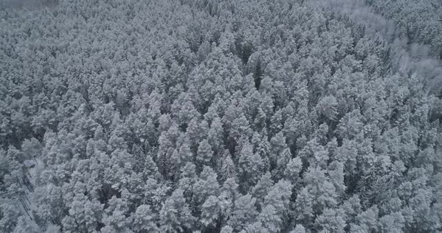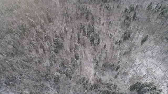 Aerial of snow covered forested mountains.