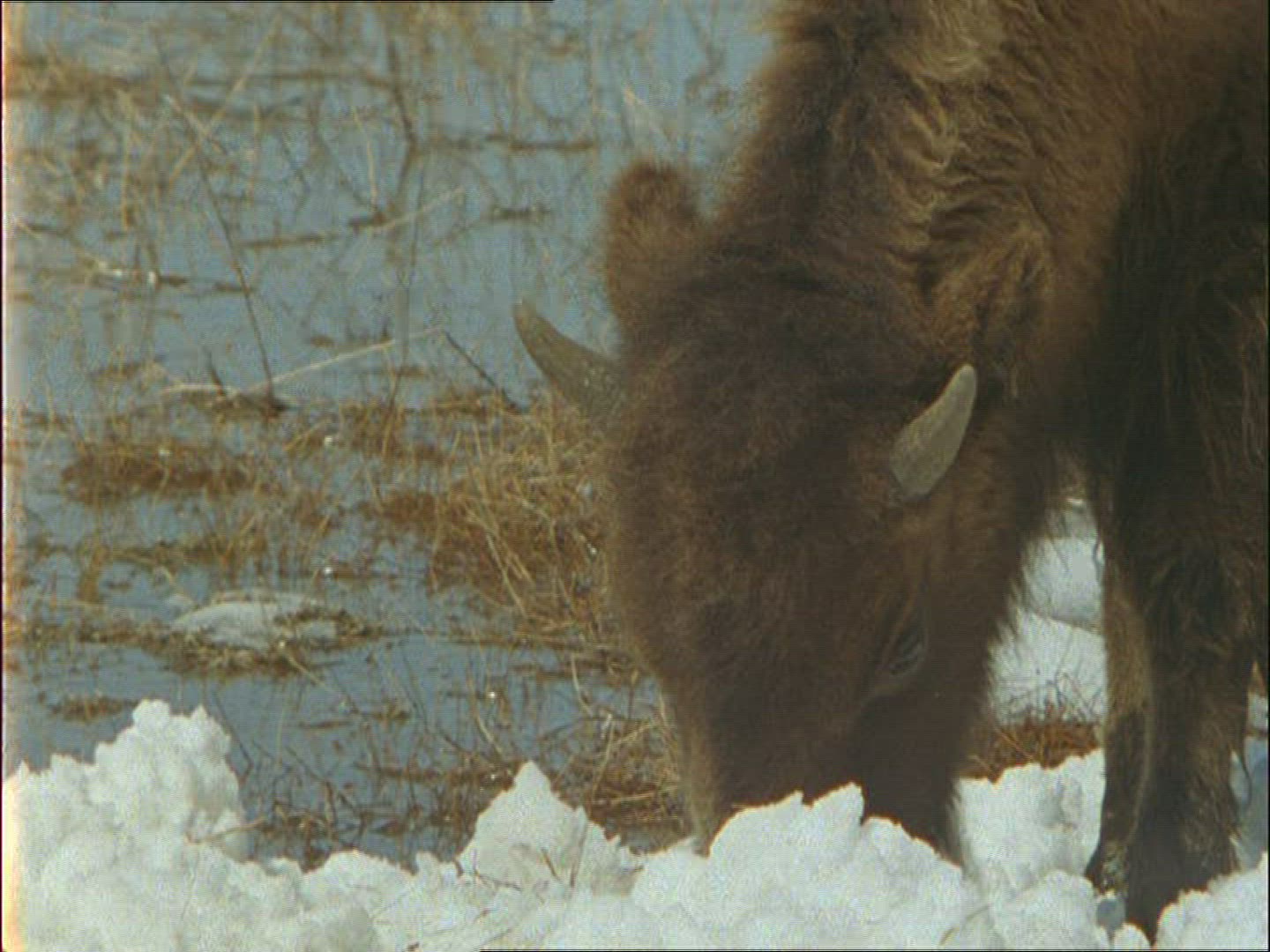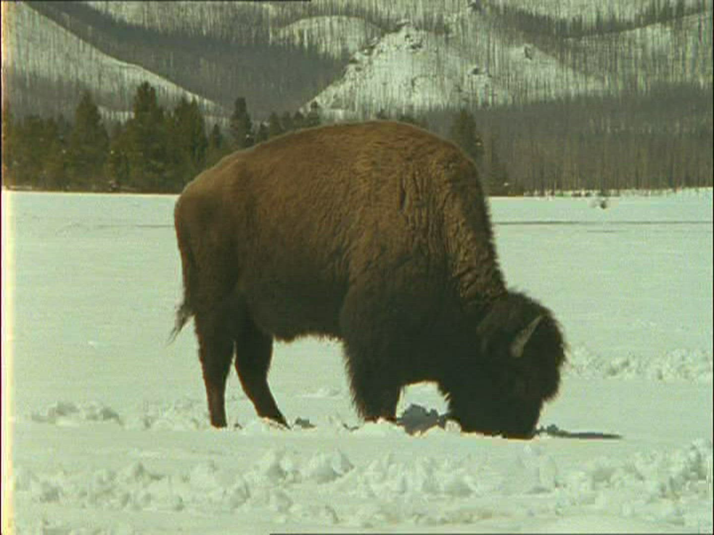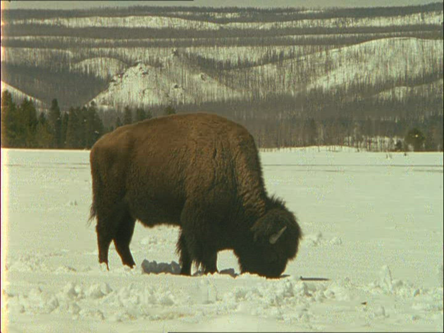 > Line of bison walking in the snow