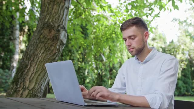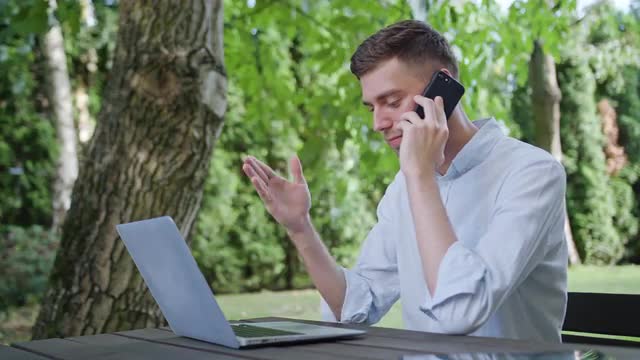 A man with a beard smiling and using a phone against a gray background. Medium shot. Soft focus