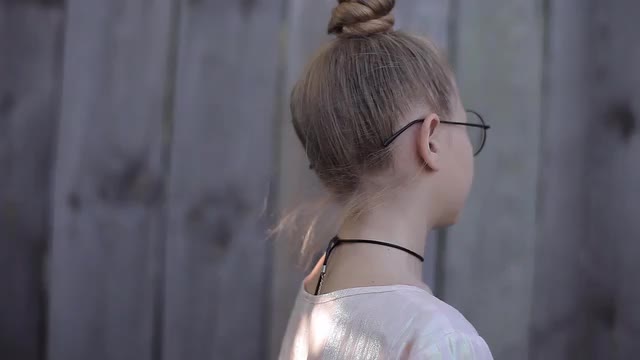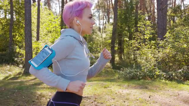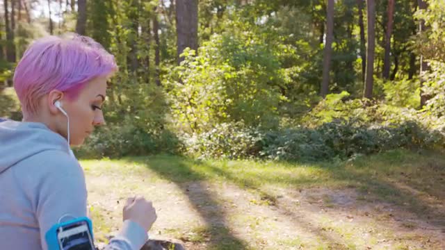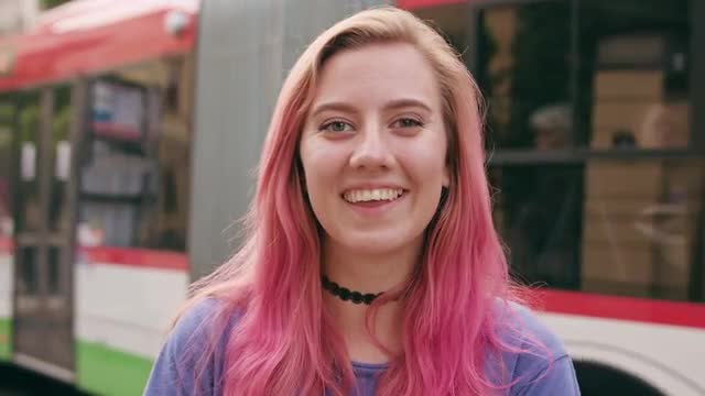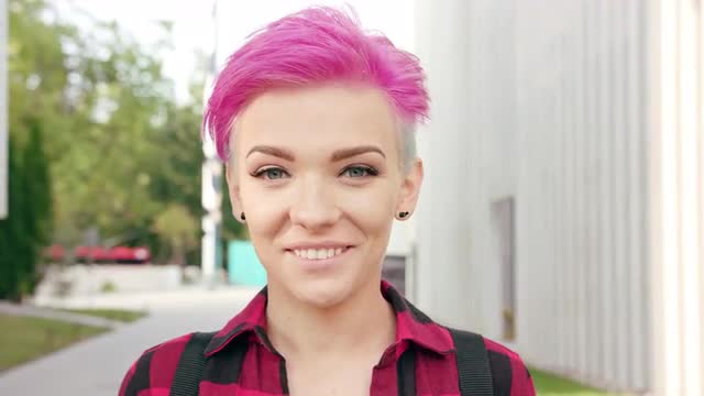 A surprised woman with a pink hair in the city street. Close-up shot. Soft focus