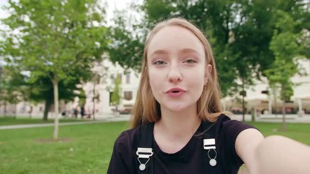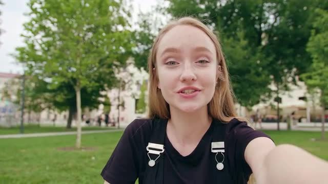 A happy smiling red-haired woman wearing big earrings in the city street. Close-up shot. Soft focus