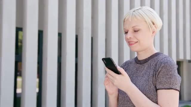 An attractive young blonde lady using a phone in town. Medium dolly shot. Soft focus