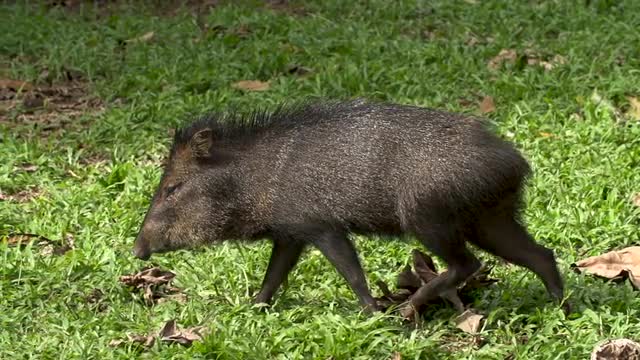 > Peccary walking in leafy grass, wide highspeed