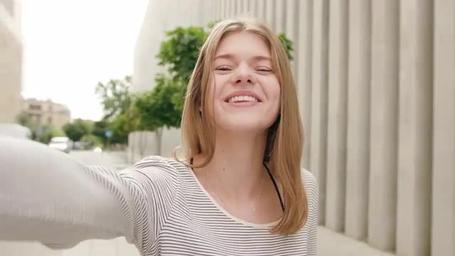 A happy smiling red-haired woman in the city street. Close-up shot. Soft focus