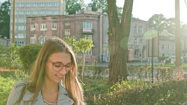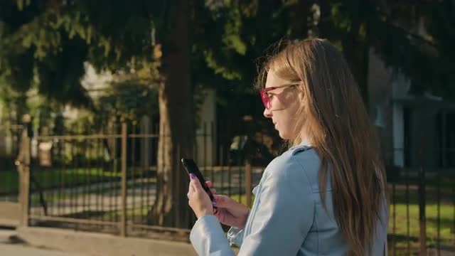 A happy smiling lady using a phone in the city street. Medium shot. Dolly shot