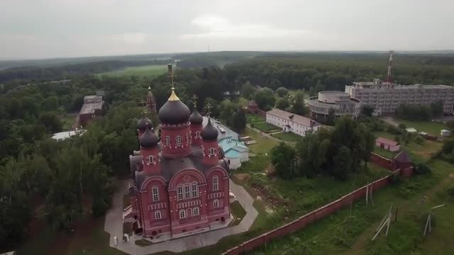 > Flying over Lukino Village with Ascension Cathedral, Russia