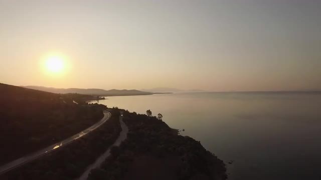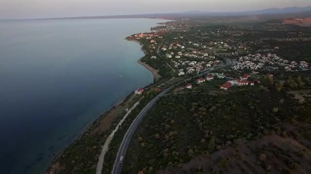 Aerial shot of sea coast with green trees and road along waterfront, Greece