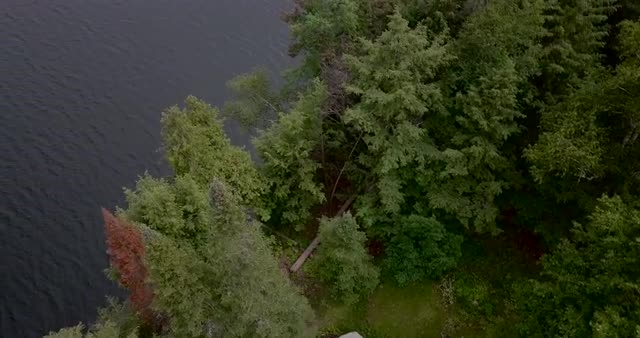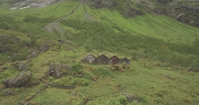 Aerial view of town with cottages among green hills, transport traffic on the road. Scene of Trikorfo Beach, Greece