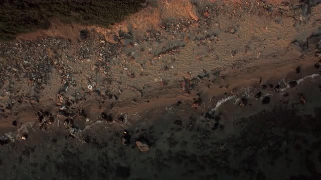 > Aerial scene of sea, coastline and Trikorfo Beach with green hills. Greece