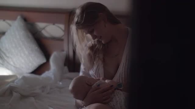 Bassinet with pink blanket near the bed with sleeping mother in maternity hospital