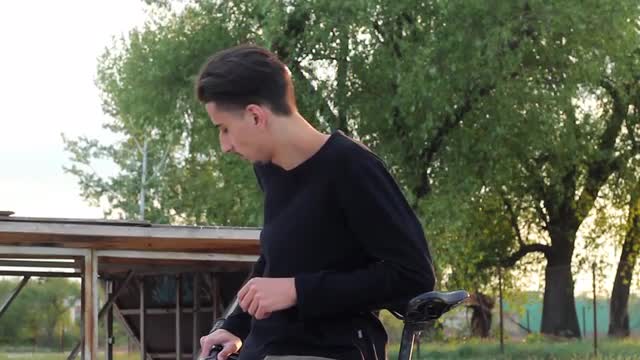Boy riding a bike in the yard. Child is frightened when he losing the treadles moving closer to camera