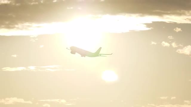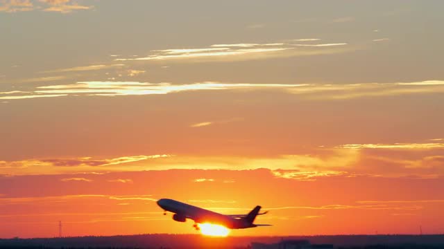 Airplane taking off against the golden evening sky. Flight at sunset