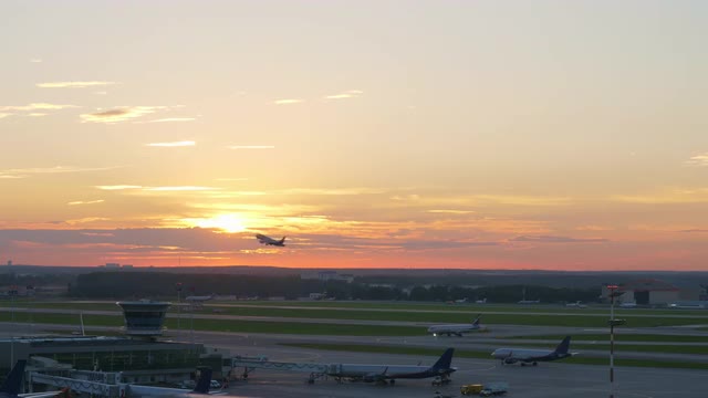 1031196 - View of airport at sunset, plane taking off