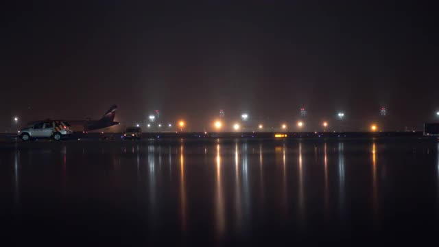 Night city with plane taking off reflecting in the glassy facade of cafe on building rooftop