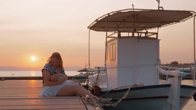 Evening view of small harbor. Boats tied up along the pier with packed fishing tackles on it. Orange sky with mountain silhouettes on horizon