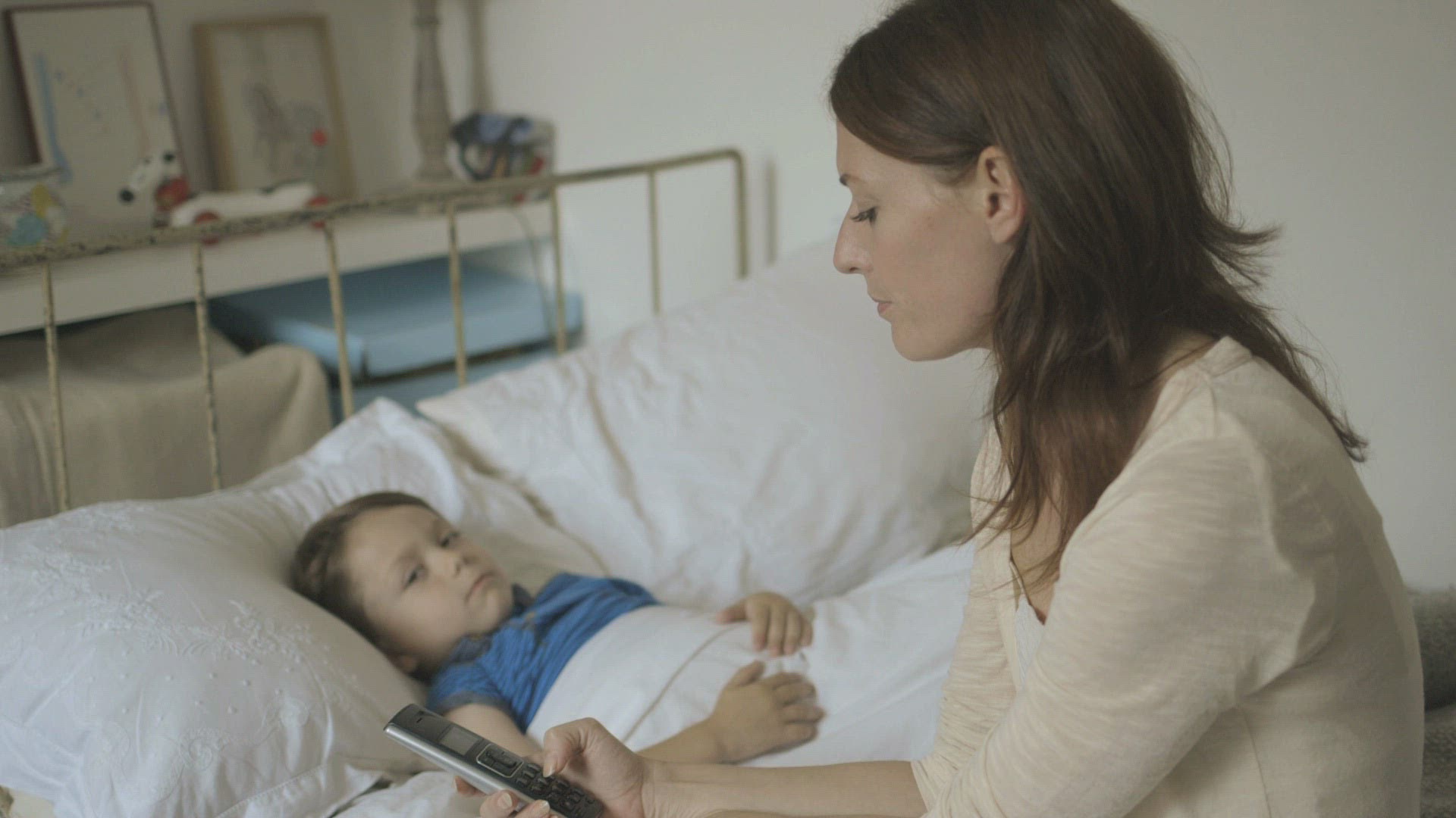 Mother spending quiet minutes with baby. She sitting on the bed at home, holding daughter in hands and talking to her
