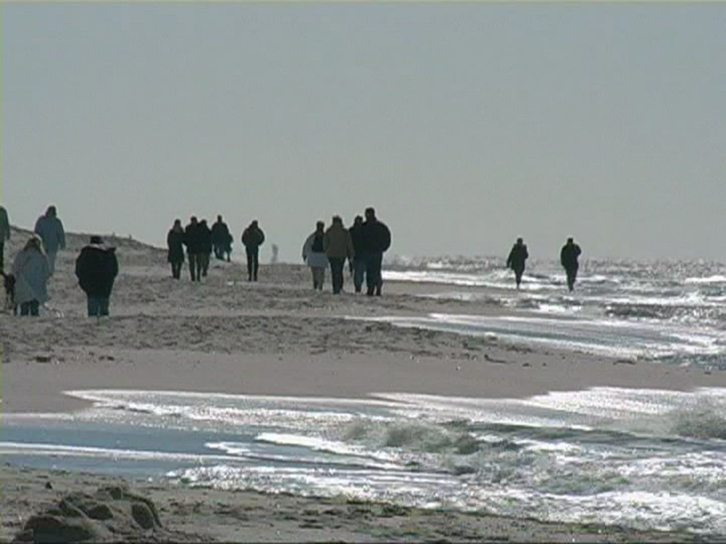 Top view of barefoot man vacationer walking along the beach and sea waves washing his feet. Holidays at the seaside