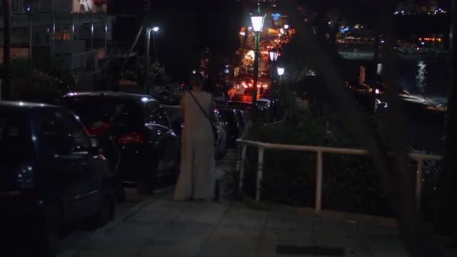 Young mother having late walk with baby carriage in the neighbourhood. Outing before going to bed