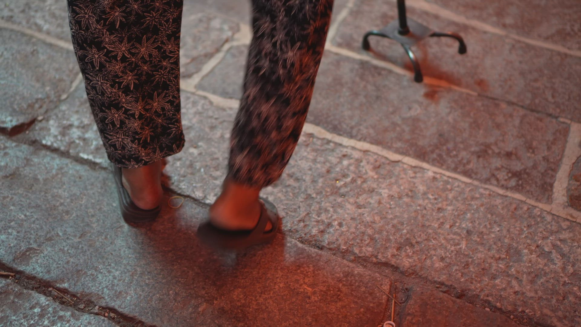 Back view of a young woman walking in desert poorly lighted street. She is scared to be alone outside at night