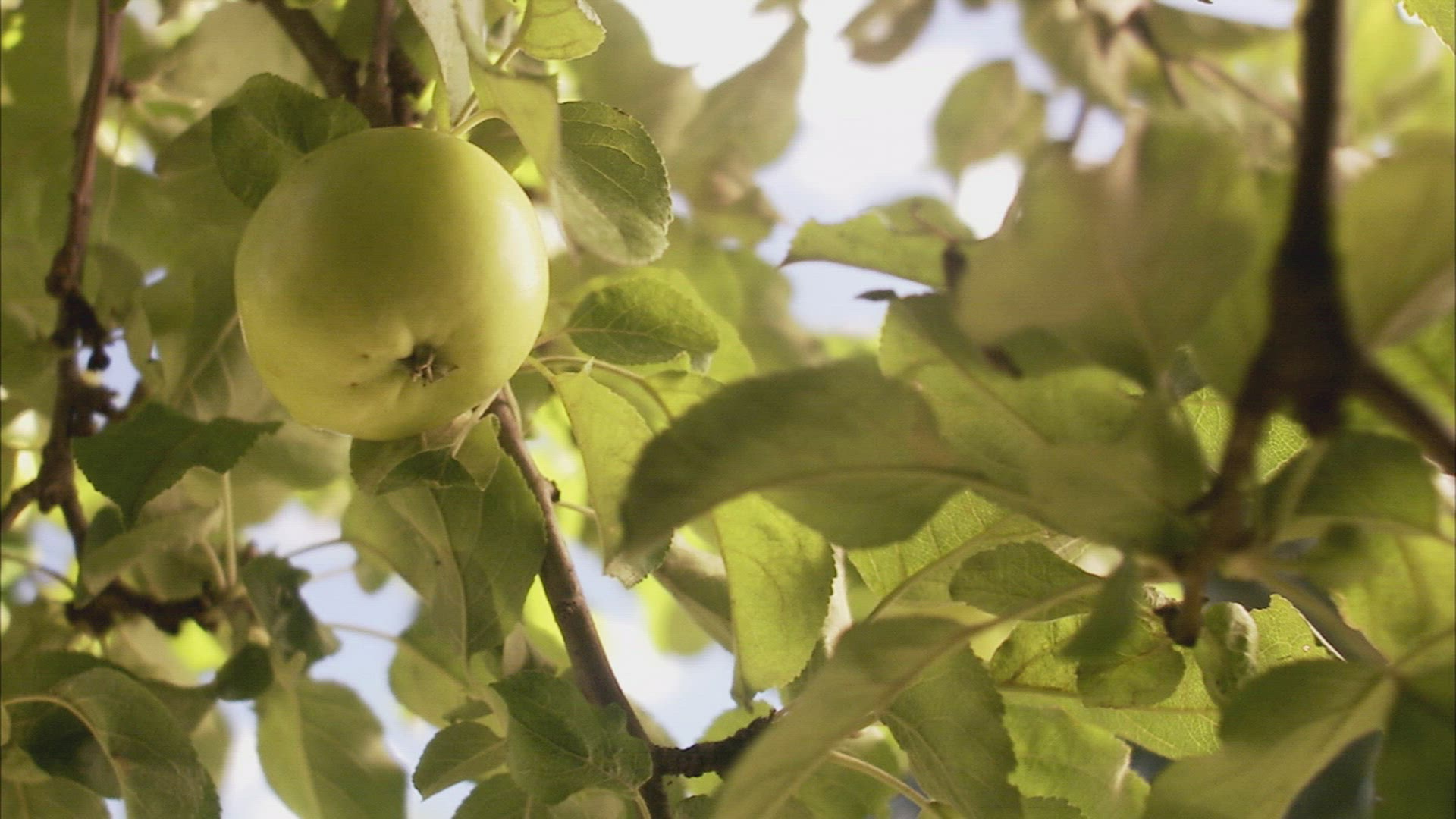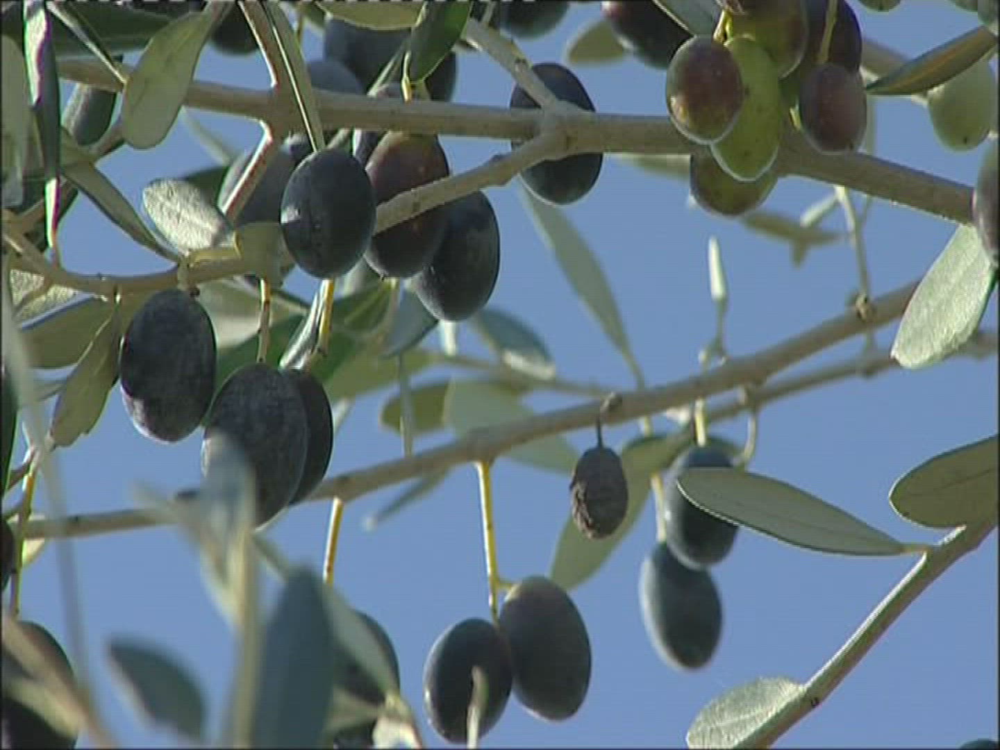Wide-branching olive tree covered with fruit in green house garden, sun rays striking through the branches