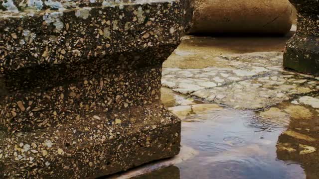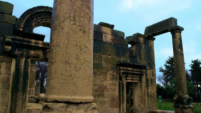 Hallway lined up with columns in the ancient building on St. Marks Square. Dim light, people walking in the distance