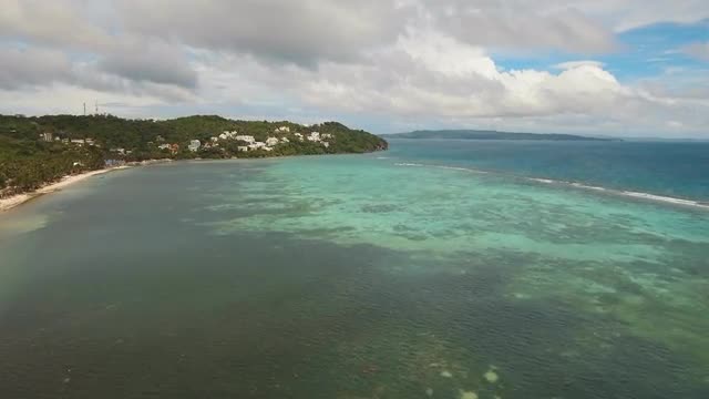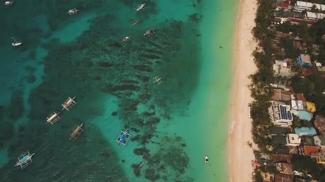 Lagoon with turquoise water and the beach in the sea bay aerial view tropical landscape, sea, boats on the surface of the water. Bali,Indonesia, travel concept. aerial footage