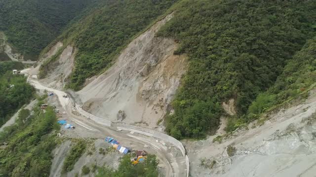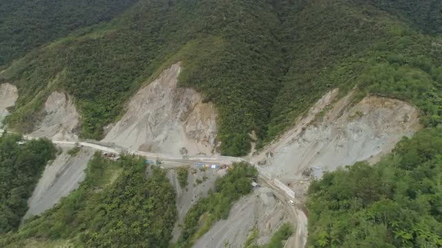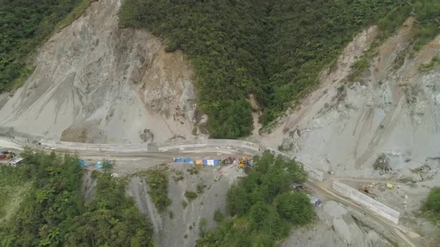 Heavy machinery at gravel and sand quarry. excavator loads gravel truck, extraction volcanic sand at sorting crushing complex. rock crushing and screening equipment Agung, Bali, Indonesia