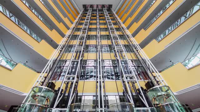 ANTALYA, TURKEY - NOVEMBER 11, 2017: Low angle shot of people in shopping mall riding on escalator going down, view against glassy roof and sunshine