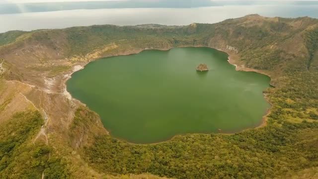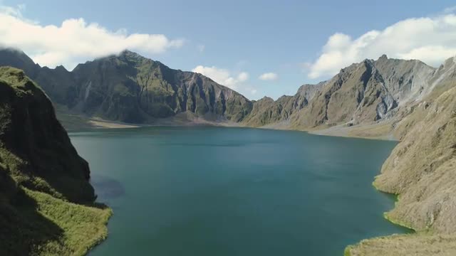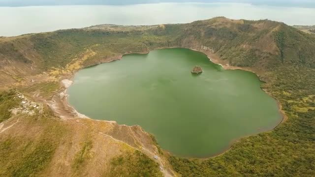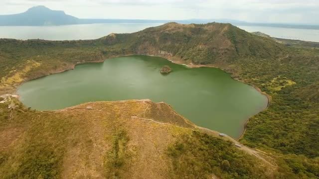 Aerial view mountain landscape with crater acid lake Kawah Ijen where sulfur is mined. Sulfur gas, smoke. Ijen volcano complex group of stratovolcanoes in East Java Indonesia