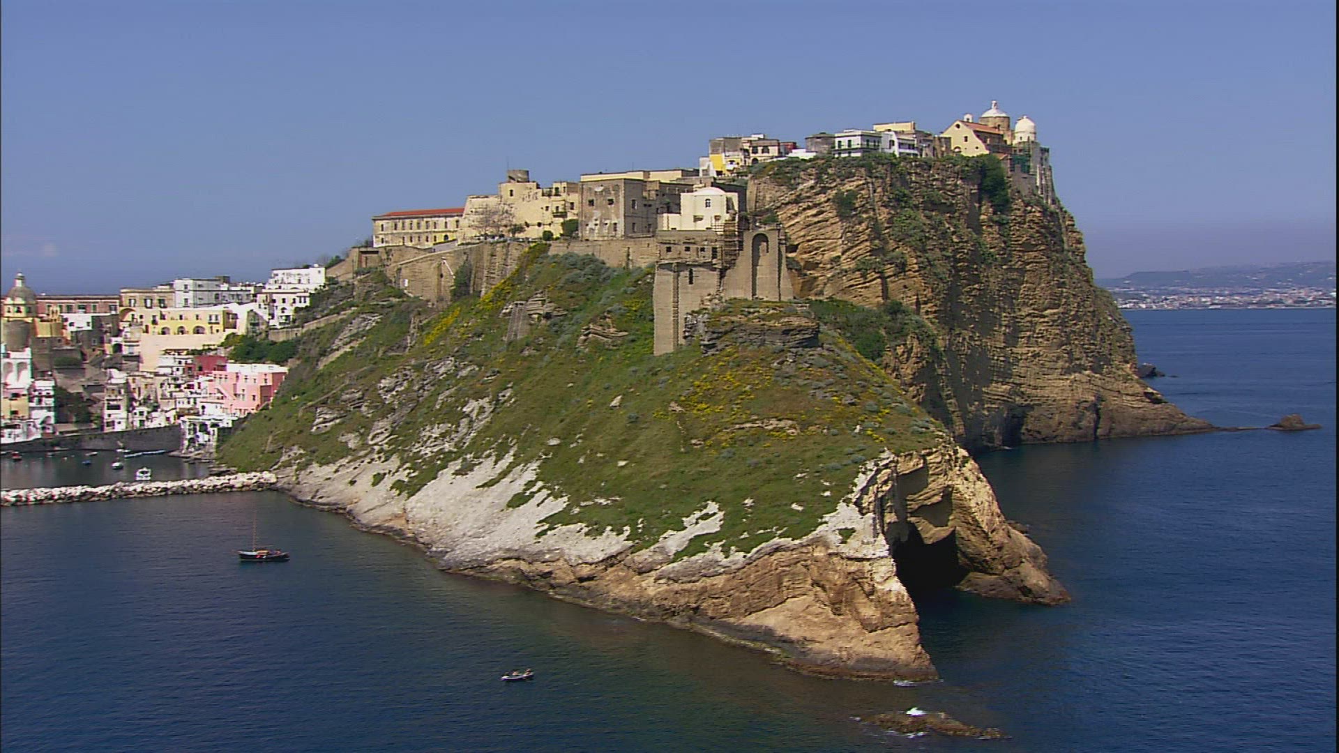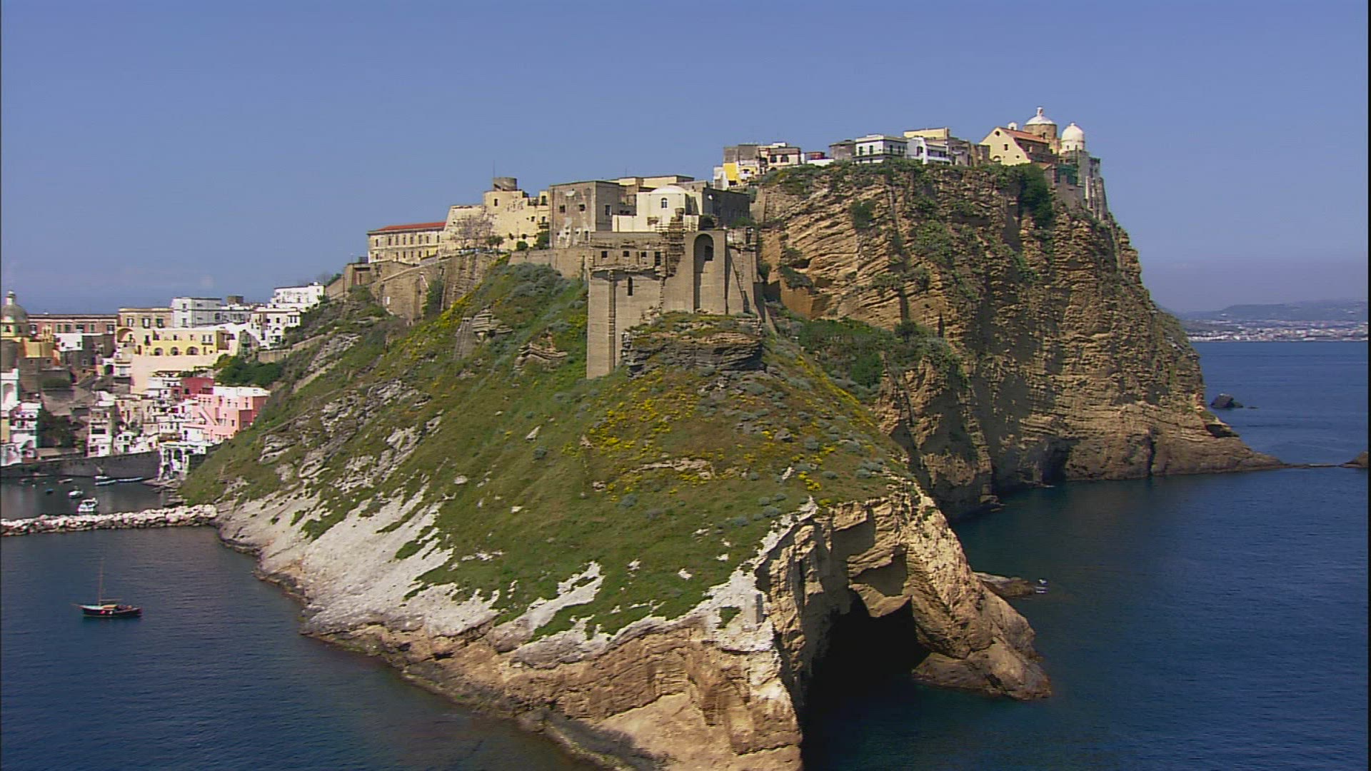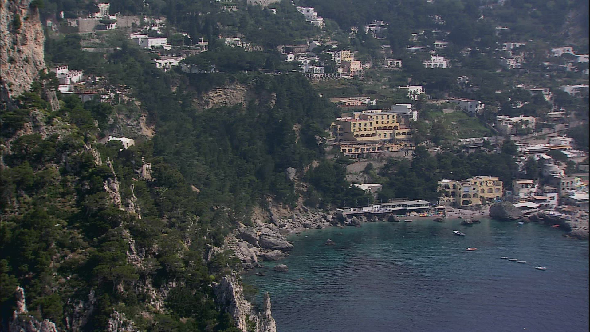 > Floating along rocky mountain on sea shore. Hillside houses on steep slopes