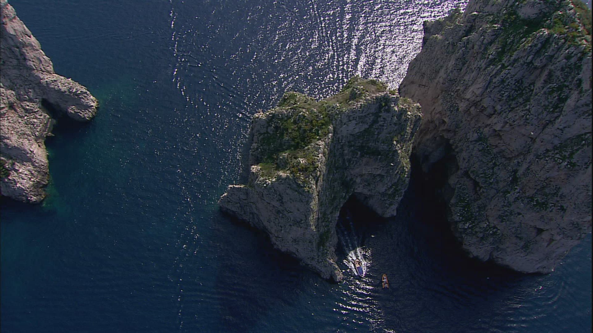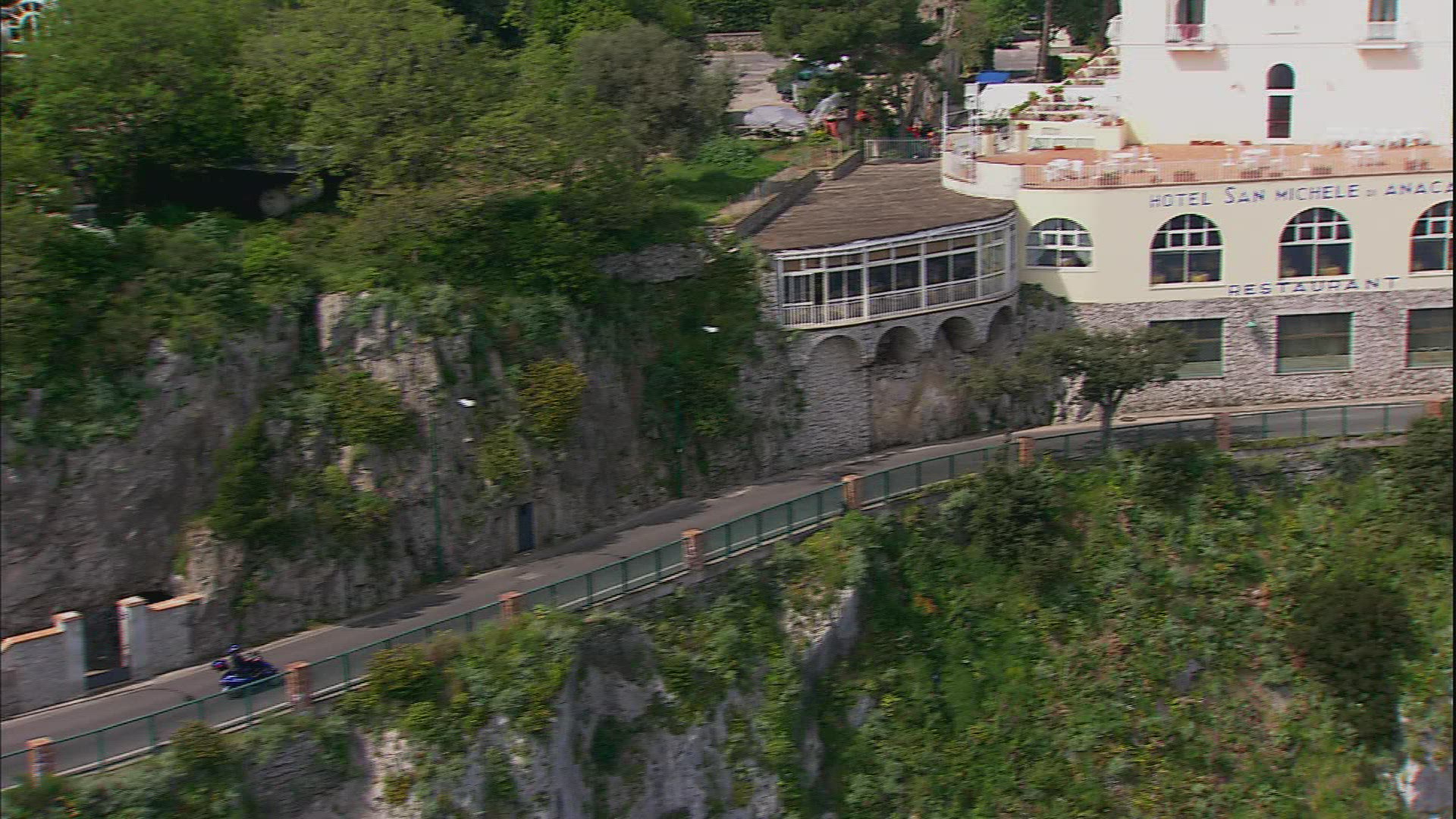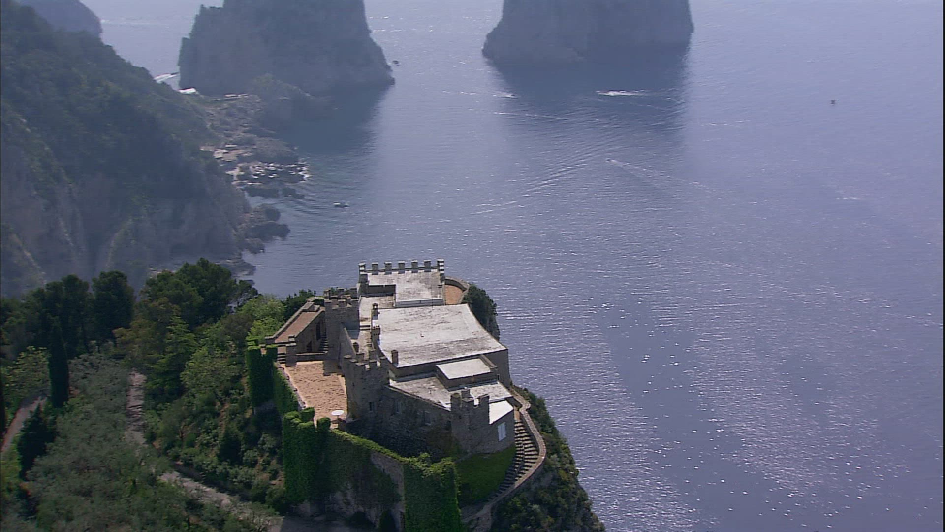 > Floating along rocky mountain on sea shore. Hillside houses on steep slopes