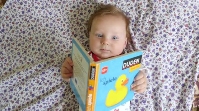 Baby points with his finger to cyclist drawing in illustrated book