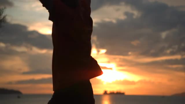 Slow motion shot of man jumping/bouncing with sunset behind him.