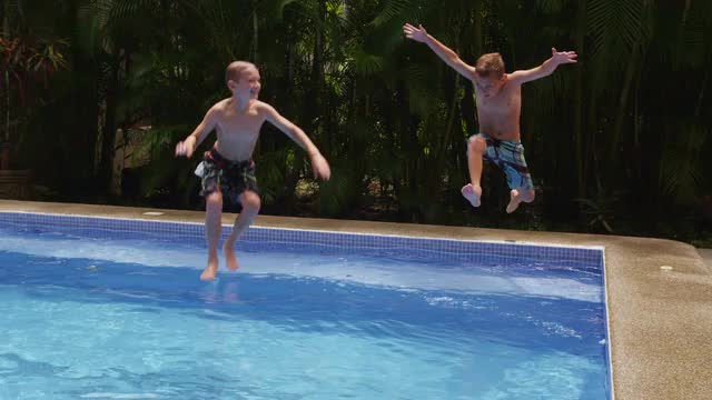 Slow motion close-up view of smiling child in goggles bathing in outdoor swimming pool on hot day