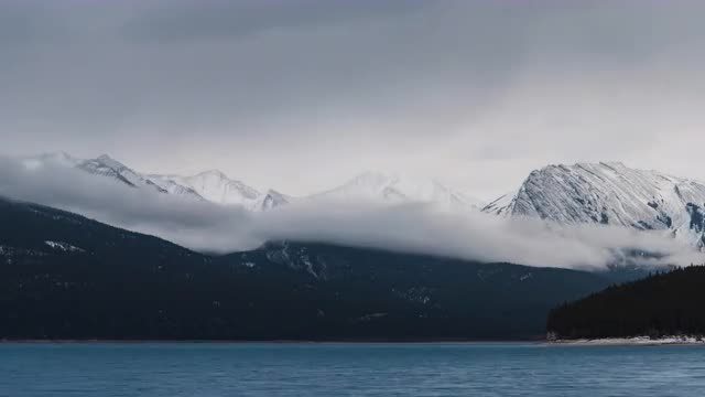 8K Time lapse clouds flowing over snow cappedmountains above blue lake