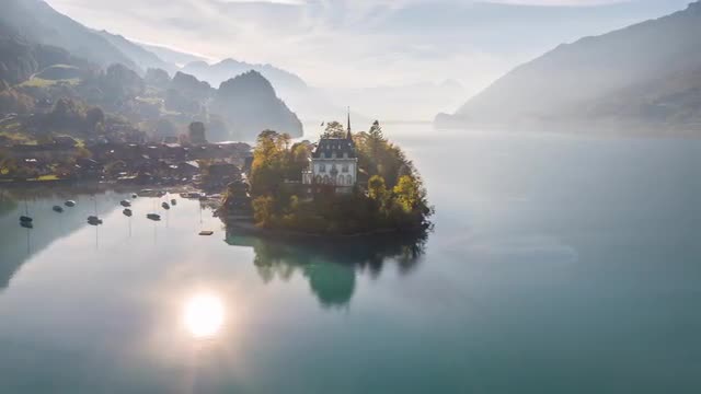 > Beautiful Lake Brienz Turquoise Iseltwald Switzerland Aerial 4k