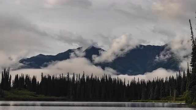 Winter, Alaska driving shot along lakeside with snow-covered trees |forest foreground and background of snowy mountains.
