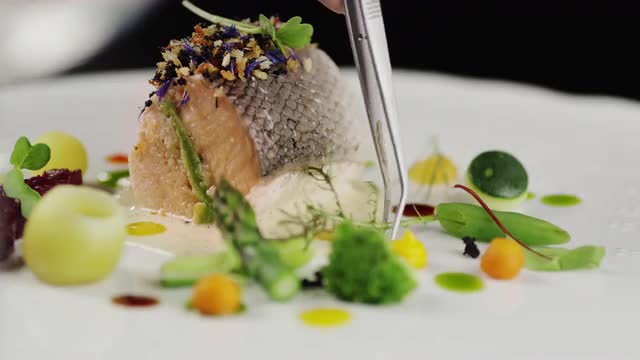 470802 - Chef places slice of smoked salmon on a blini preparing hors d'oeuvres
