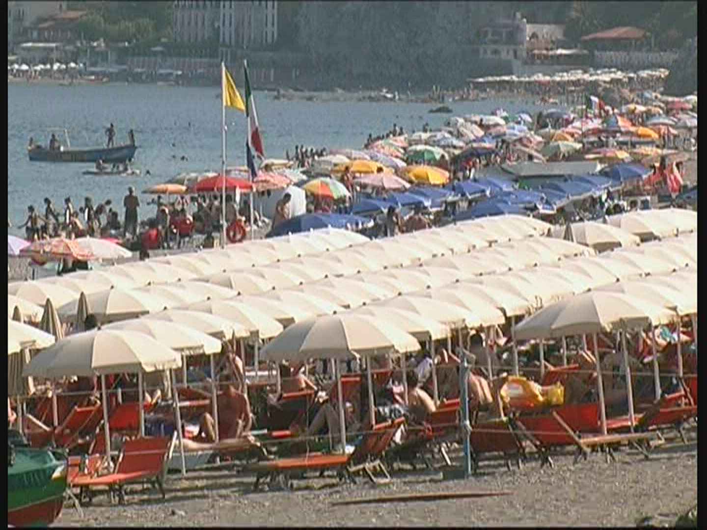 Rows of umbrellas lining the beach . R3D available upon request.