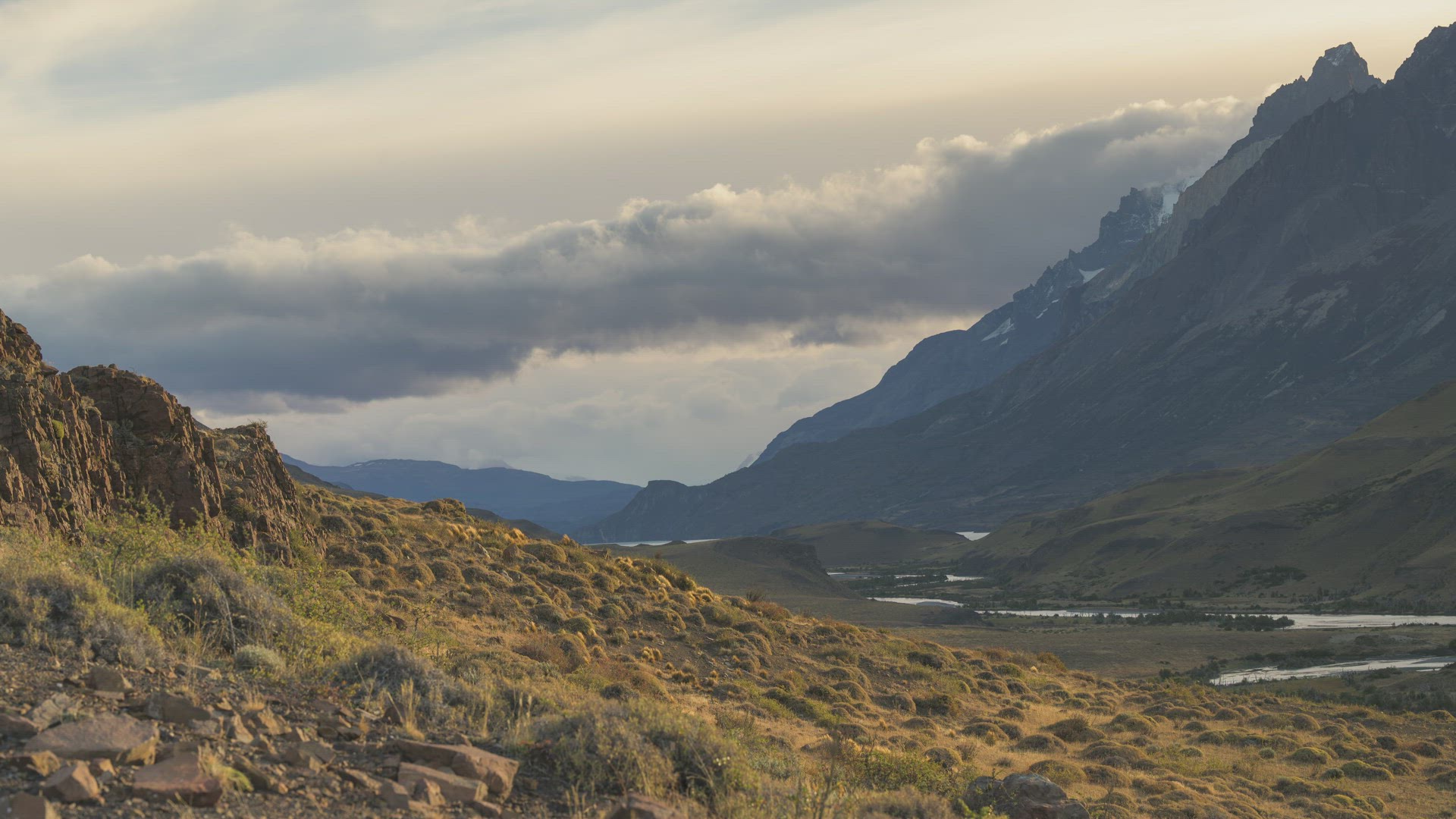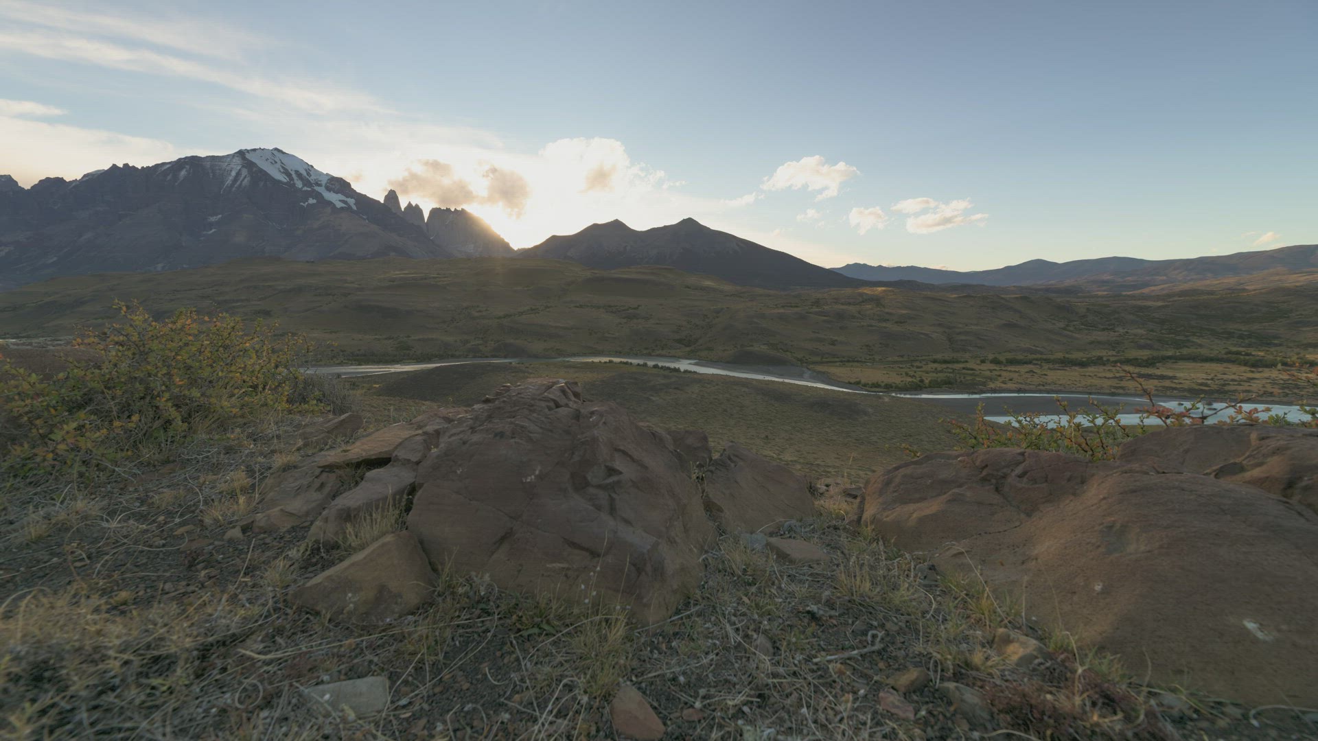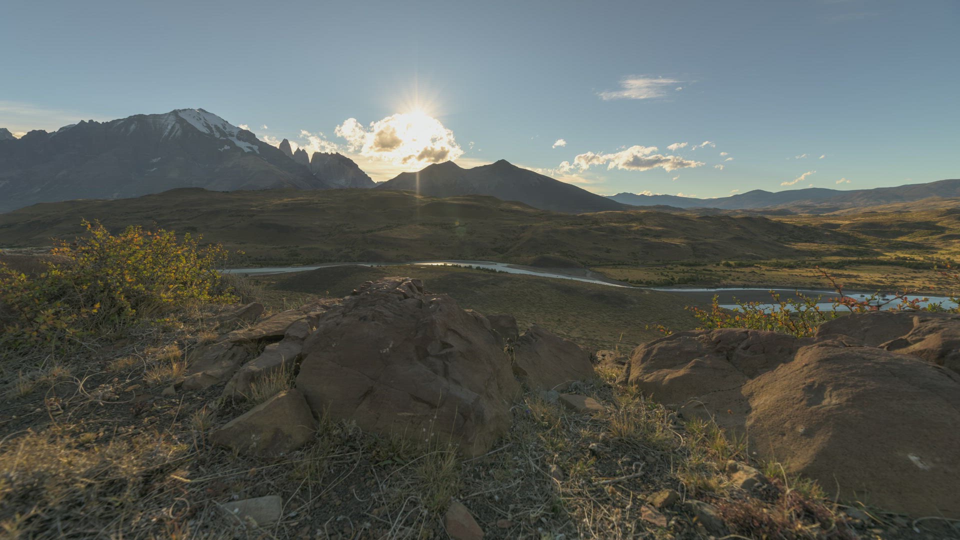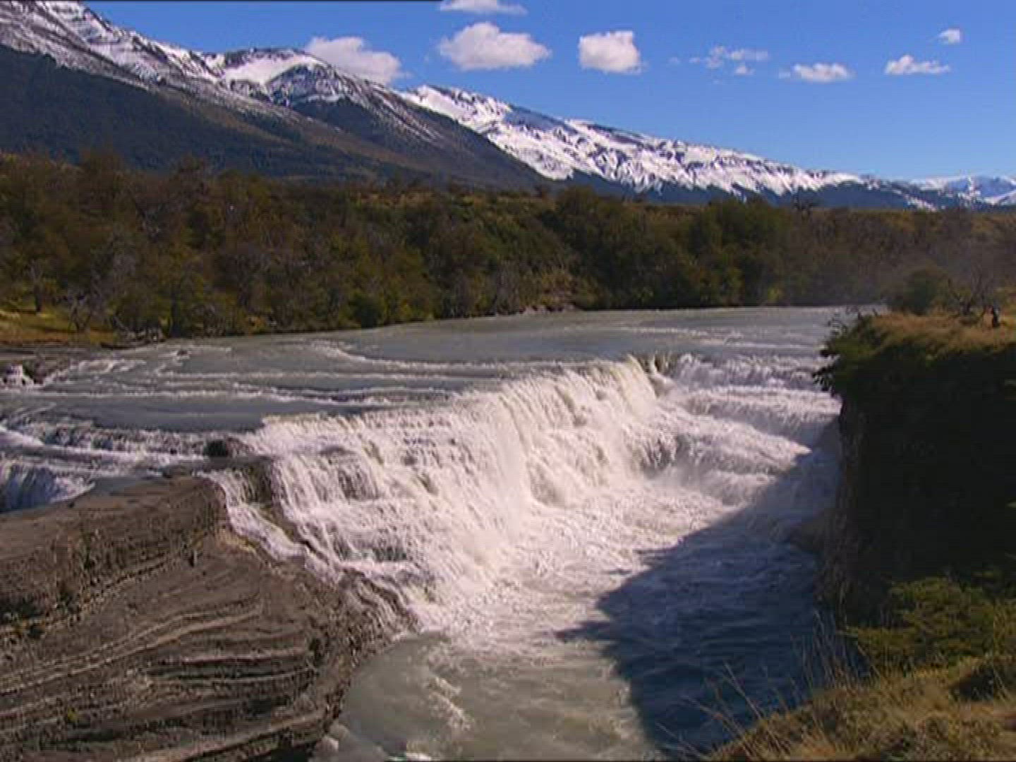 Aerial of a long, winding river in Patagonia during the summer. The snow-capped Andes Mountains loom in the background.